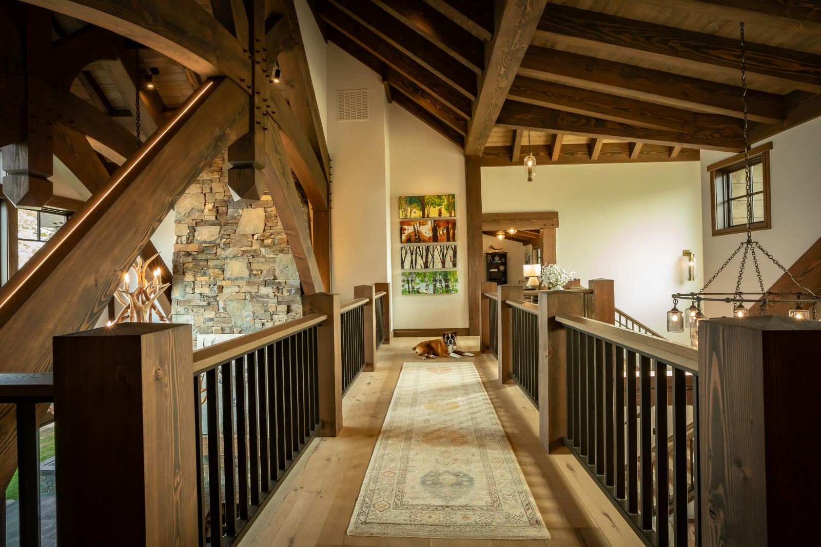 This custom lakefront home in North Idaho uses expansive windows to capture panoramic water views, flooding the interiors with natural light. Inside, heavy timber trusses, exposed beams and detailed upper bridge lend the interior its signature character. Designed for family retreats, the home offers generous indoor-outdoor living spaces, a chef's kitchen and a golf simulation room.